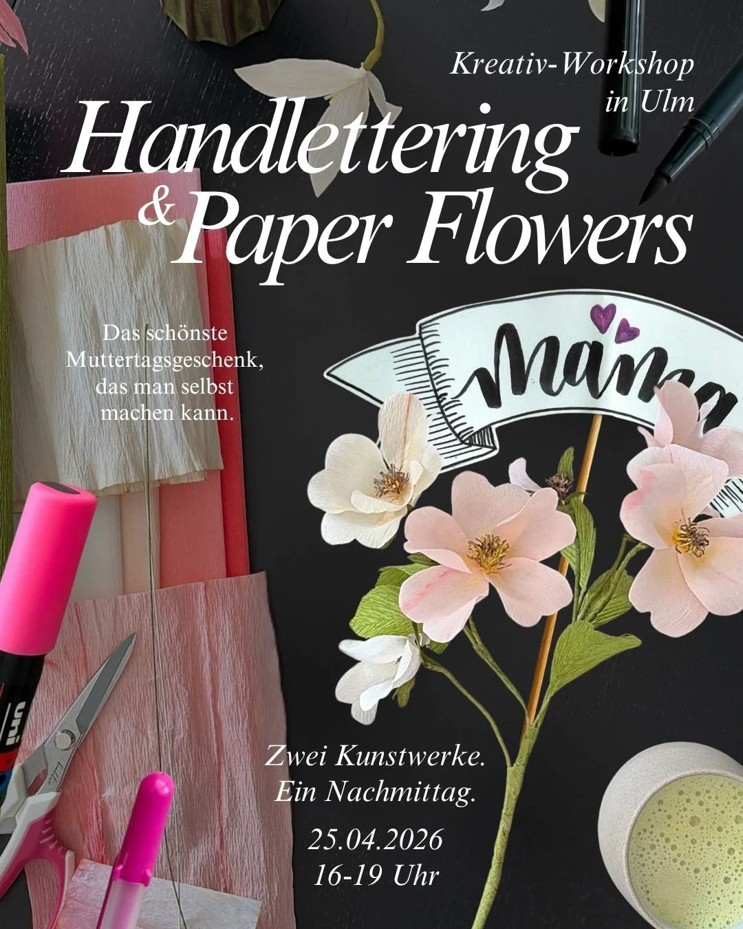 In diesem 3-stündigen Kreativ-Workshop am 25.4.26 in Ulm gestalten Sie ein liebevoll handgemachtes Muttertagsgeschenk: ein individuell gelettertes Schild kombiniert mit einer edlen Papierblume.
